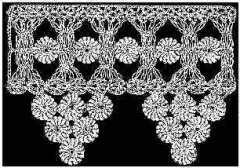 11th row. Same as sixth, but in place of the treble at the end, begin a daisy, work in 4 rolls and fasten to the side of second daisy, work in 4 more rolls and begin another daisy, work four rolls in that and fasten to the top of the second daisy, 4 rolls more in that daisy and begin the last one, work in 4 rolls and fasten on the top of the third daisy, 12 rolls in the daisy and join, 8 rolls in the next and join, 8 rolls in the next and join.