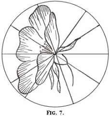 Figs. 8 and 9 show our principle applied in the third case to the constituent parts of the morning-glory blossom. The base of the tube is easily discovered and on it as a center we may construct our circle with its radii and so find the stitch direction. Fig. 18. When we consider the flaring corolla alone we find its point of radiation by "producing" the stem to the point where it would be attached if the flower had no tube. Then we may proceed to apply our rule. Fig. 9.